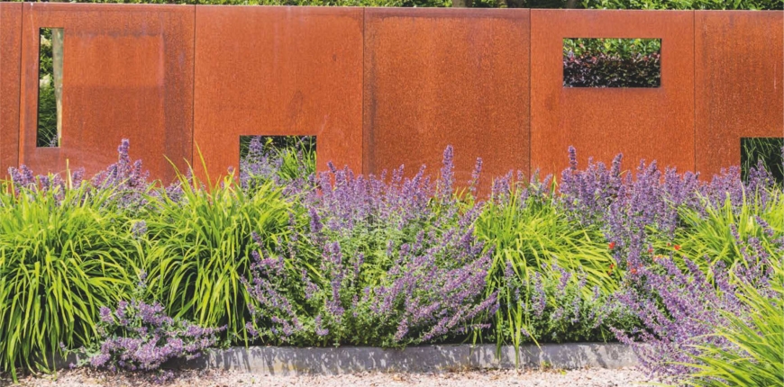 Industrialna estetyka, tak modna w ostatnich czasach w wystroju wnętrz, ma również silną reprezentację w nowoczesnych aranżacjach ogrodów. Styliści przestrzeni zielonych coraz odważniej wyznaczają miejsca na tak nietypowe dotąd elementy jak ściany, przesłony, monolity. Te, pozornie nie mając uzasadnienia funkcjonalnego, staję się jednak niezwykle ciekawym tłem-ekranem kontrastującym z posadzonymi w jego sąsiedztwie roślinami. Pojawiają się więc drewniane ażurowe parawany, panelowe trejaże z tworzywa czy gabionowe murki. Hitem stają się metalowe, skorodowane albo lustrzane ścianki. To prawdziwe designerskie nowum. Pokryte rdzą panele, słupy i ekrany stanowią niezwykle ciekawy barwny kontrast dla zieleni, ale również wspaniale grają z odmianami roślin o płomiennych rudych kwiatach, stanowiąc jednolity kolorystycznie klimat. Drugim top trendem staje się odważne umieszczenie w ramach ogrodu luster. Specjalnie produkowane na ten cel wykonywane są z trwałego, odpornego na warunki atmosferyczne akrylu. Są to produkty lekkie i zdecydowanie wytrzymalsze niż lustra szklane. Dają niezwykle ciekawy efekt, powiększając optycznie przestrzeń naszego ogrodu, a jednocześnie stwarzając efekt trójwymiarowości. Lustra w ogrodzie odbijają dodatkowo światło tworząc świetlne refleksy, a także podkreślają grę barw kwiatów na rabatach.