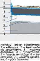 Wykonuje się go nad pomieszczeniami. Waga warstw jest duża (wylewka cementowa, z której wykonywane są warstwy spadkowa i dociskowa waży ok. 20 kg/m2/cm grubości) i musi być brana pod uwagę przy obliczaniu wytrzymałości stropu. Układ warstw jest niemal podobny, jak tarasu nieocieplonego, ale między warstwą spadkową a dociskową znajduje się izolacja termiczna. Pod nią jest paroizolacja, chroniąca przed dostępem pary wodnej przedostającej się z niżej położonych pomieszczeń. Na ociepleniu układa się hydroizolację, zapobiegającą przedostawaniu się do niego wody opadowej. Paroizolacja - wykonywana jest z folii i układana na zakład. Jeśli powłoka ma być elastyczna, można zastosować płynne folie lub polimery. Ułatwiają one dokładne zabezpieczenie trudnych miejsc, takich jak naroża. Warstwa termoizolacyjna - powinna mieć grubość co najmniej 12 cm, wykonuje się ją ze styropianu EPS 100-038 i 200-036 oraz polistyrenu ekstrudowanego. Fazowane krawędzie płyt umożliwią wykonanie szczelnego połączenia. Hydroizolacja - budowa tej warstwy zależy od sposobu odprowadzania wody. Może on polegać na dokładnym uszczelnieniu pokrycia tuż pod posadzką lub na zastosowaniu drenażu odprowadzającego przenikającą przez pokrycie wodę po izolacji przeciwwilgociowej. W pierwszym przypadku na termoizolacji należy umieścić izolację przeciwwilgociową z folii (chroni ocieplenie przed zawilgoceniem podczas wykonywania warstwy dociskowej). Folię układa się na zakład i z wywinięciem na ścianę. W drugiej metodzie na termoizolacji kładziona jest folia drenażowa, w której znajdują się otwory umożliwiające przenikanie wody i spływanie jej do krawędzi tarasu. Okładzinę kładzie się na warstwie dociskowej, z pominięciem hydroizolacji podpłytkowej. W tarasach ocieplanych - pomiędzy warstwami - są naprężenia, które mogą doprowadzić do rozerwania papy lub folii izolacyjnej. Zalecane jest więc wykonywanie warstwy poślizgowej z piasku zmieszanego z talkiem technicznym w stosunku 2:1 (w przypadku papy), bądź z czystego talku (w przypadku folii). Często również pod warstwą dociskową układa się warstwę poślizgową, np. z włókniny poliestrowej.