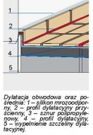 To szczeliny konstrukcyjne taśm uszczelniających. przejmujące naprężenia, które powstają wskutek ruchów warstw tarasu. Muszą przechodzić przez wszystkie jego warstwy, z pominięciem elementów konstrukcyjnych (płyta tarasowa lub strop nad pomieszczeniem). Powinny znaleźć się między ścianą budynku a tarasem oraz dzielić taras na pola o bokach 2x2 m lub 3x3 m. Wykonane w warstwie spadkowej muszą być przeniesione na warstwę dociskową i okładzinę - dylatacja przebiega w szczelnie pomiędzy płytkami. Dylatacje wypełnia się trwale elastycznym materiałem: paskami styropianu, taśmami uszczelniającymi lub sznurem polipropylenowym. Na koniec osłania się je mrozoodpornym silikonem.