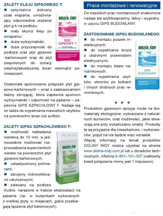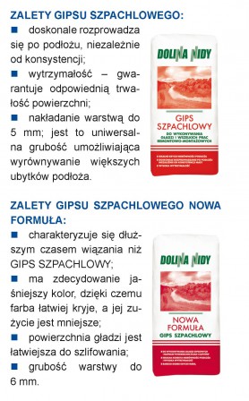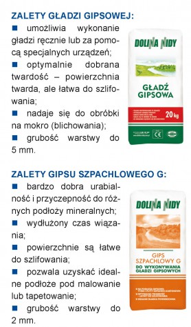 Idealną powierzchnię wykańczanych ścian gwarantują produkty gipsowe DOLINY NIDY – od gipsów szpachlowych i budowlanych, klejów do płyt gipsowo-kartonowych, poprzez gładzie, po tynki. Te ostatnie, wykonuje się coraz częściej, z uwagi na możliwość uzyskania, stosunkowo niskim kosztem, powierzchni o wysokiej jakości. Wszystkie produkty maksymalnie ułatwiają pracę zarówno doświadczonym wykonawcom, jak i tym, którzy przeprowadzają prace remontowe, we własnym zakresie.